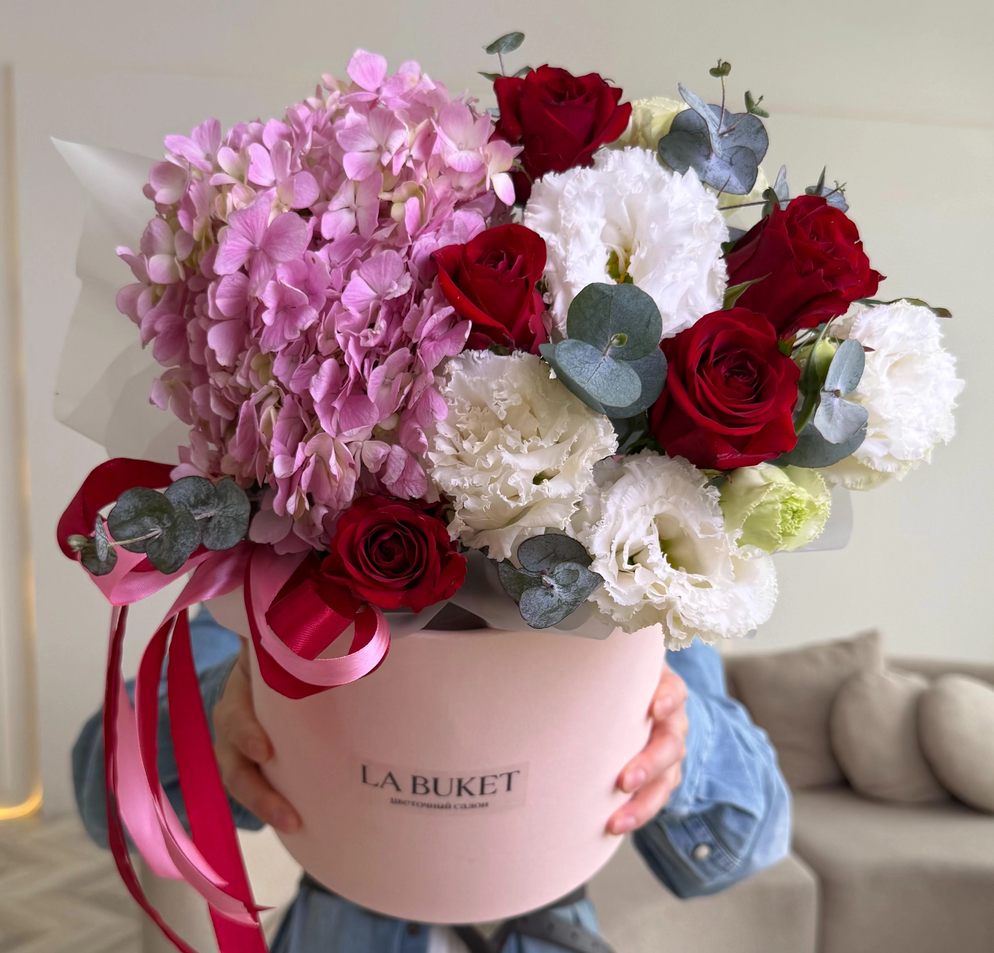 Сборная композиция из гортензии, эустомы и бордовой розы