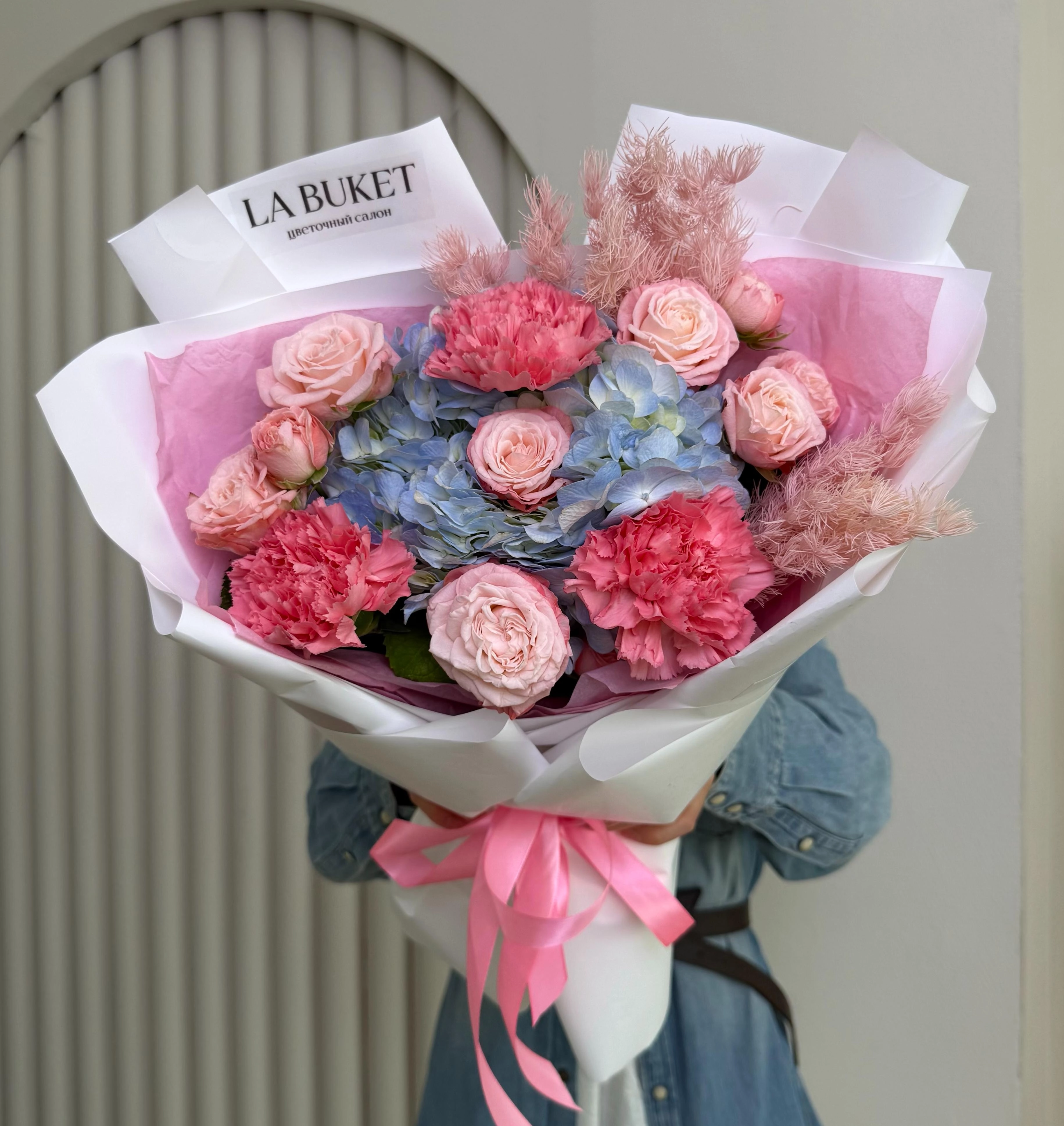 Яркий букет из гортензии, кустовых роз и диантусов