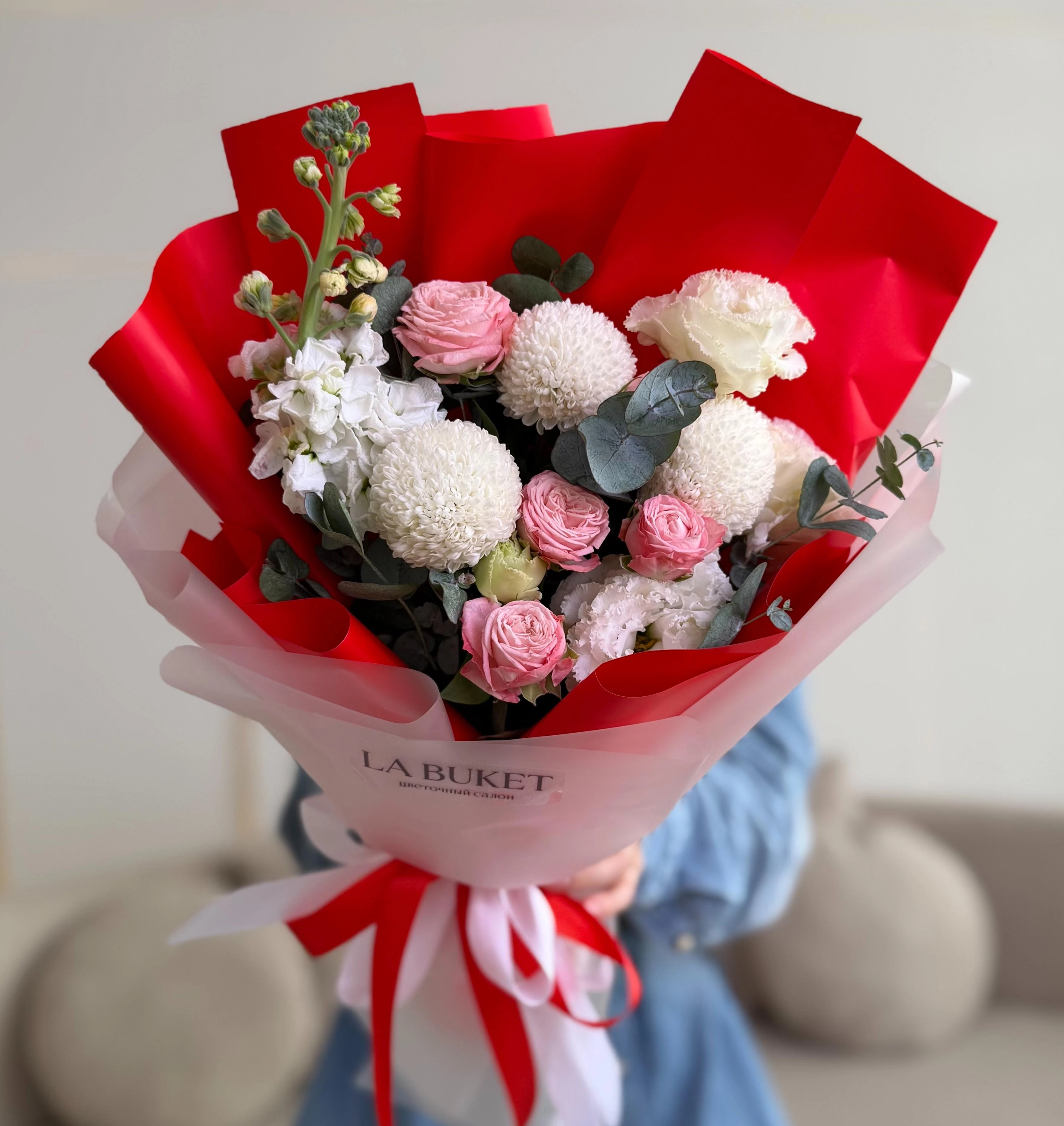 Яркий составной букет с маттиолой и кустовой пионовидной розой