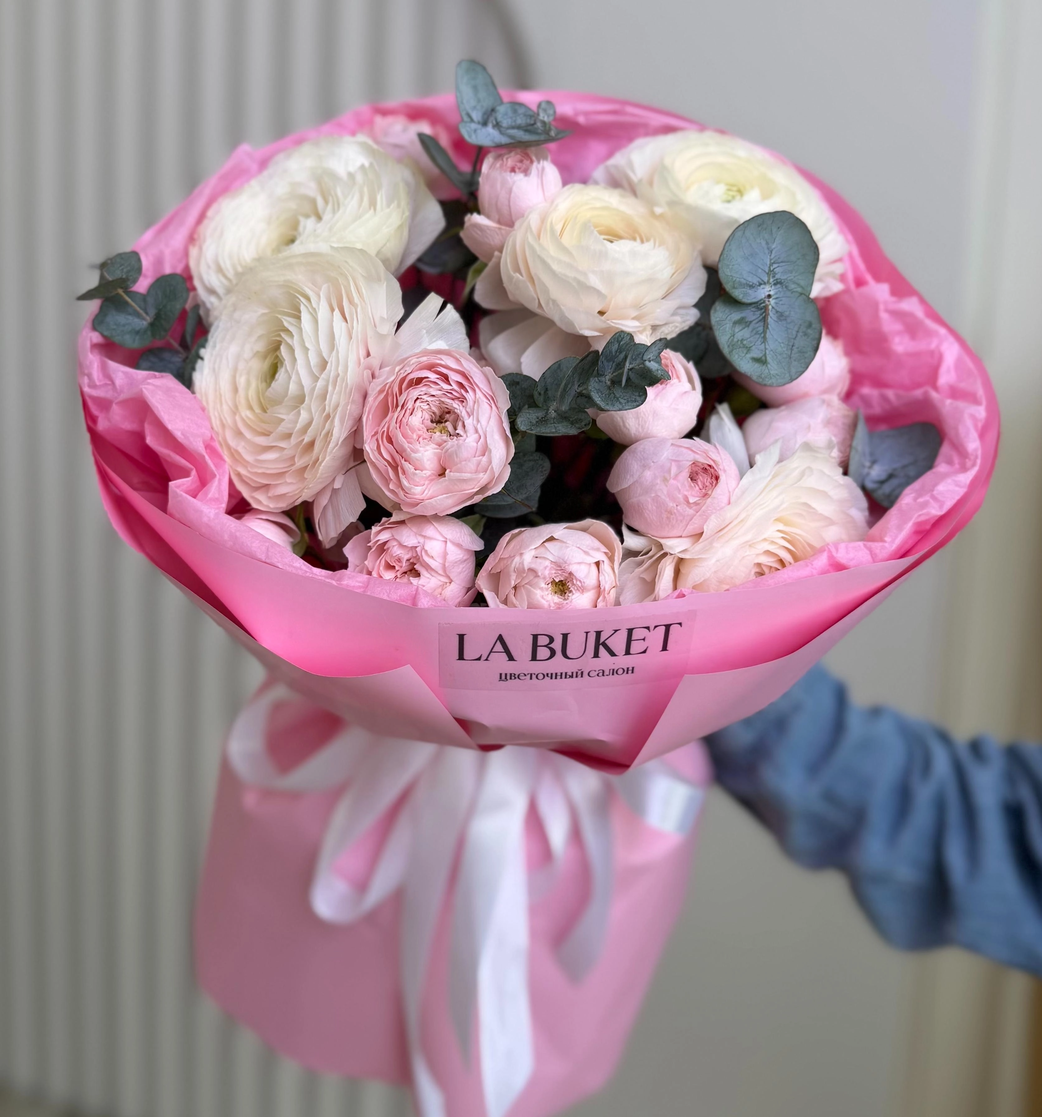 Нежный букет из ранункулюсов, кустовых роз и ароматного эвкалипта