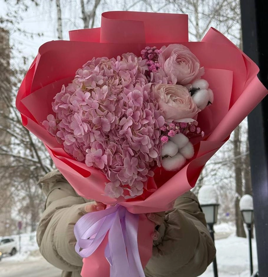 Составной букет из гортензии, ранункулюса и гипсофилы M