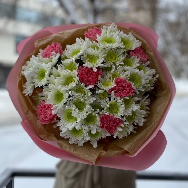 Составной букет из махровых хризантем и диантусов M