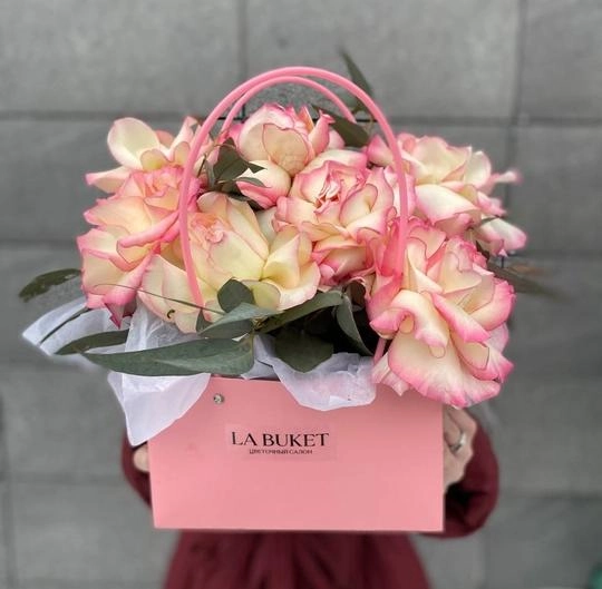 Композиция "7 французских роз с эвкалиптом в сумочке"