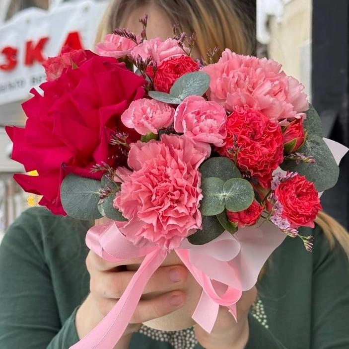 Яркие комплименты из роз, диантусов и ароматной зелени