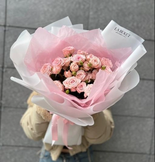 7 розовых кустовых роз 40/50 см в оформлении