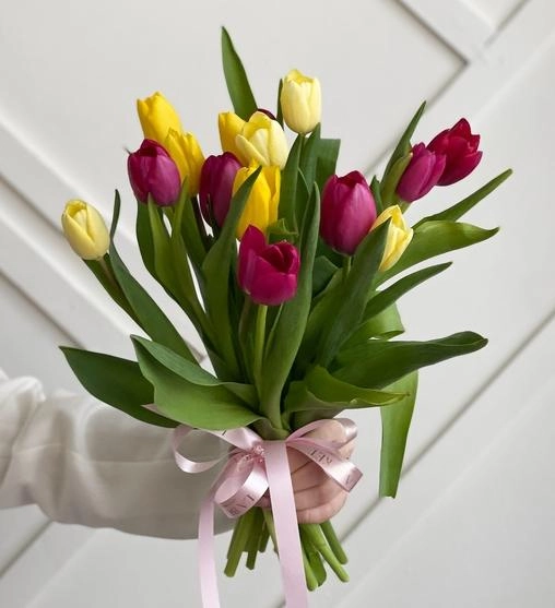 На фото представлен образец, в букете используются тюльпаны разного цвета(минимум 3)