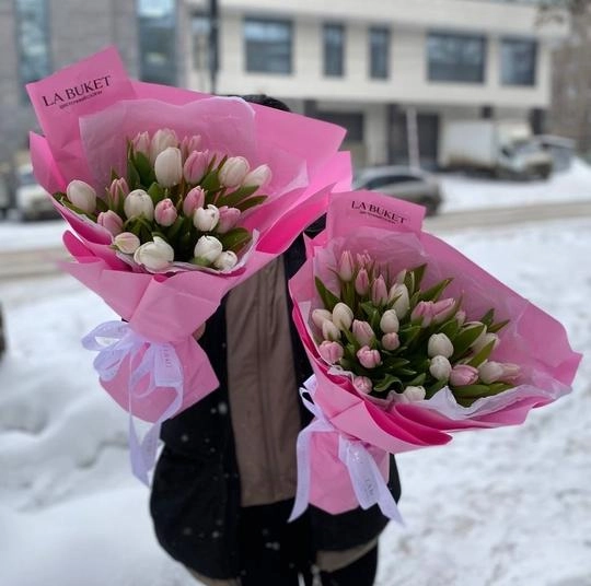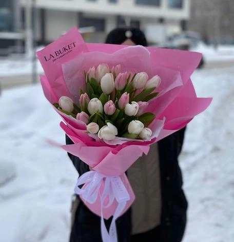 Букет "19 белых и розовых тюльпанов в оформлении"