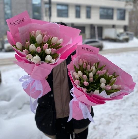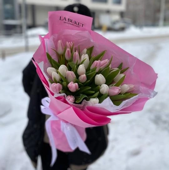 Букет "27 белых и розовых тюльпанов в оформлении"