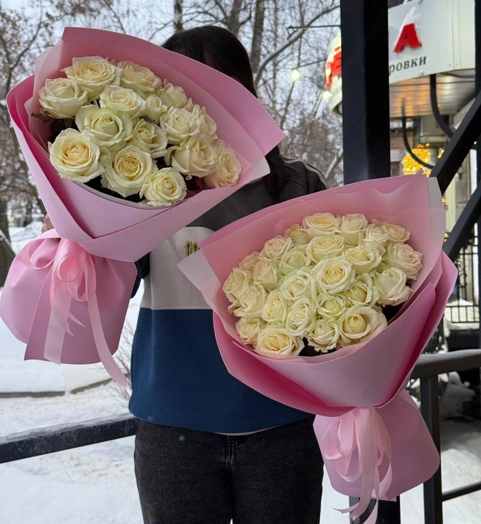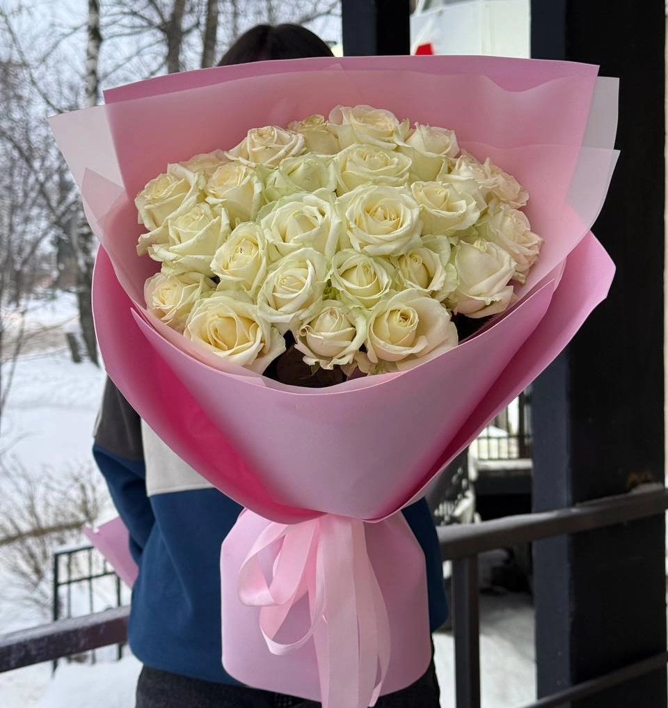 25 белых роз 50/60 см в нежном оформлении
