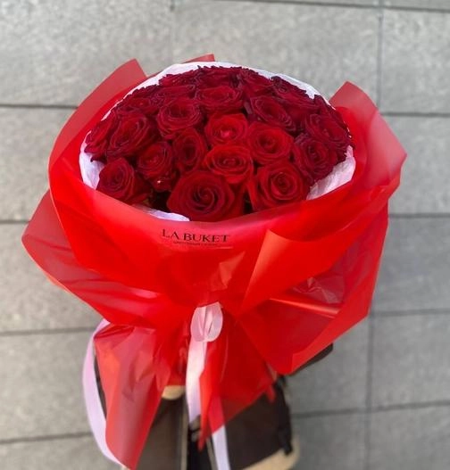 25 бордовых роз 70/80 см в оформлении