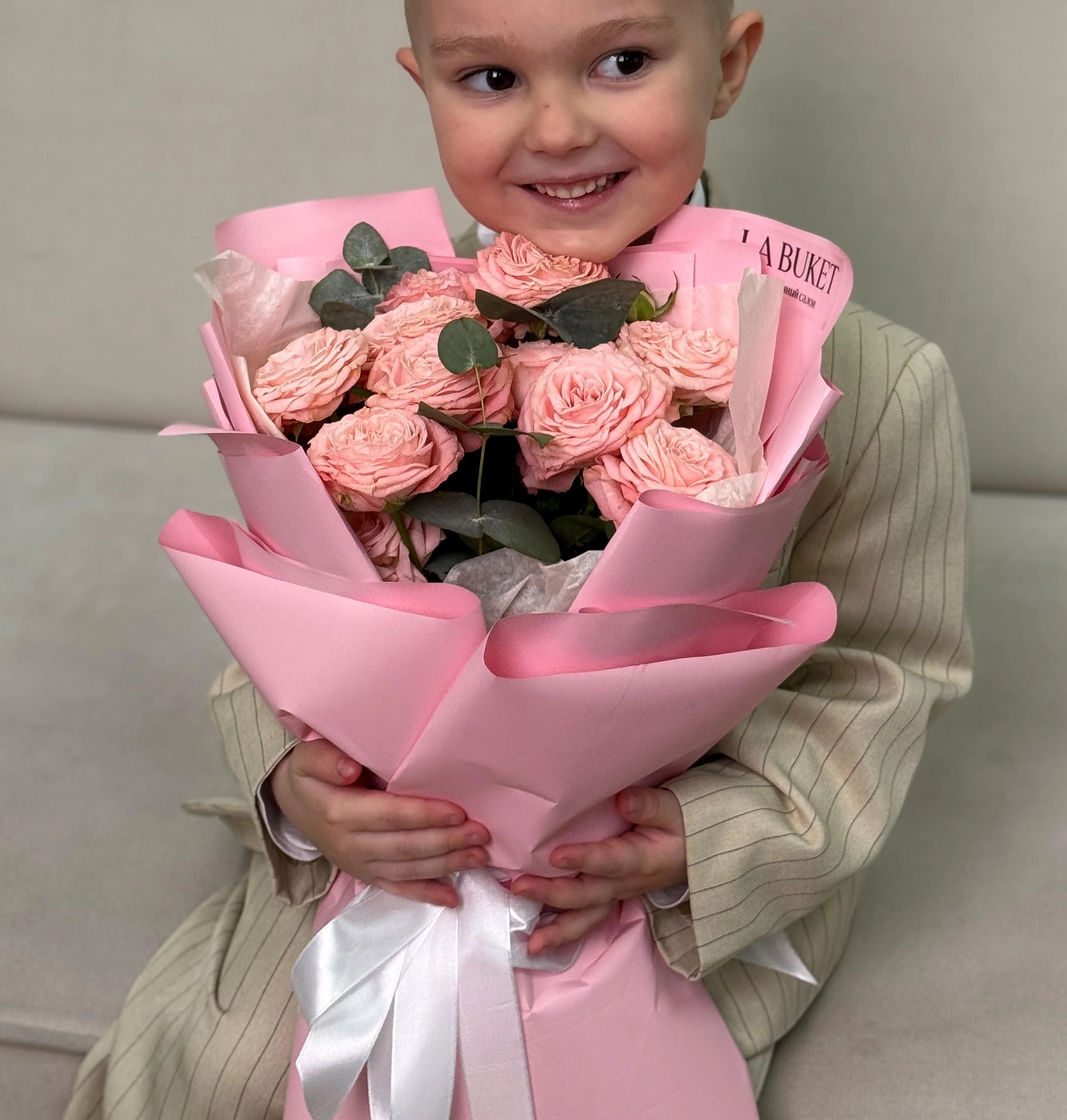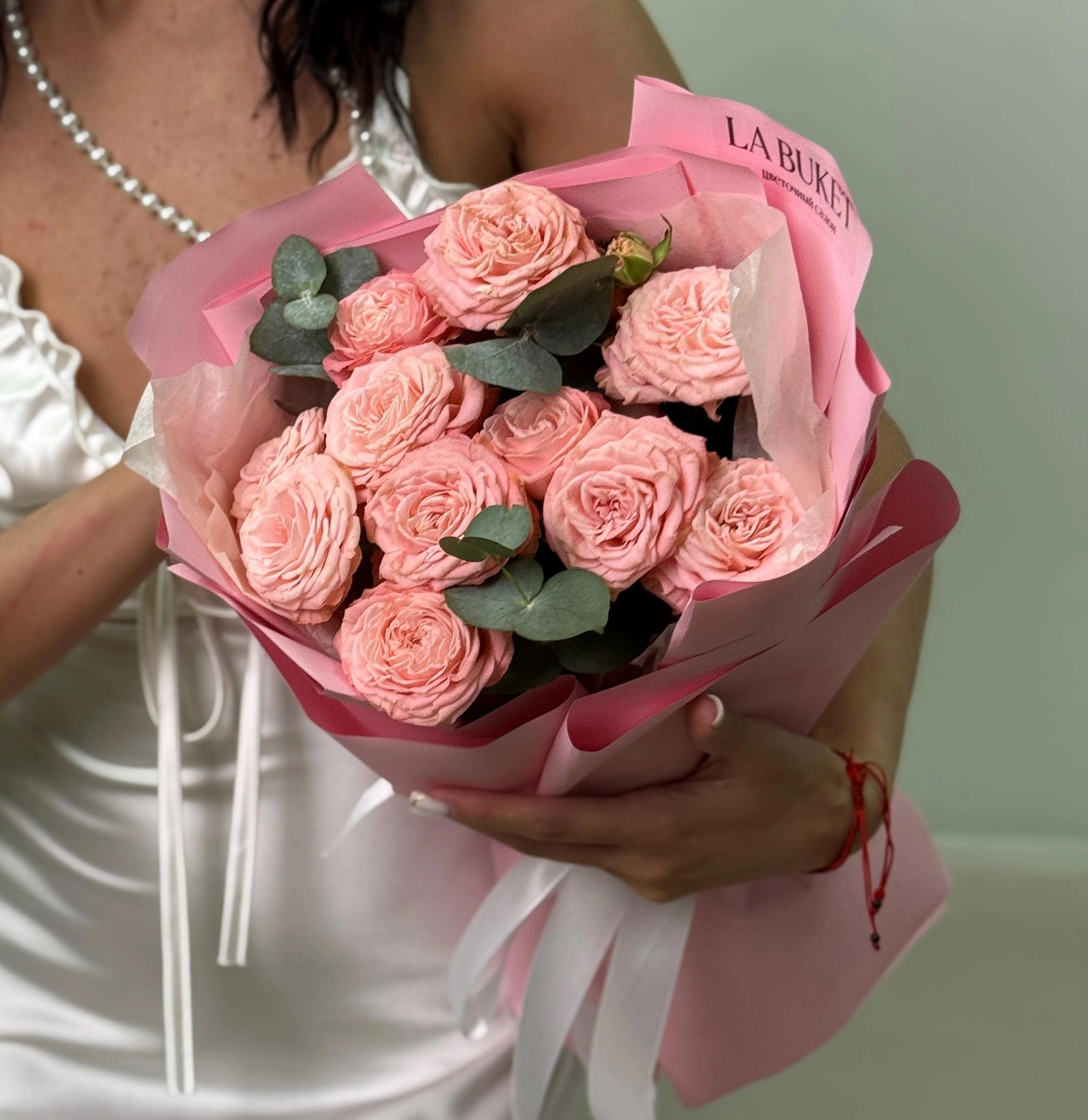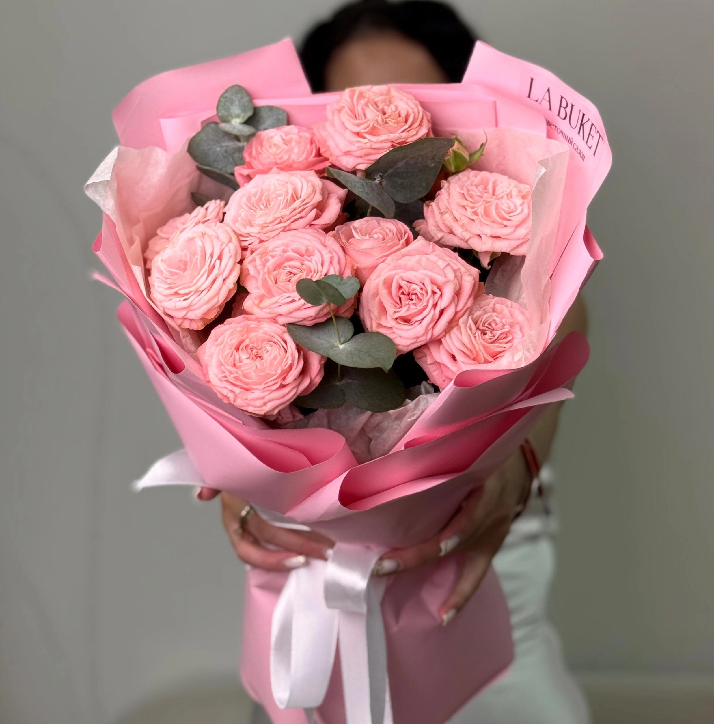 7 нежных кустовых роз с эвкалиптом
