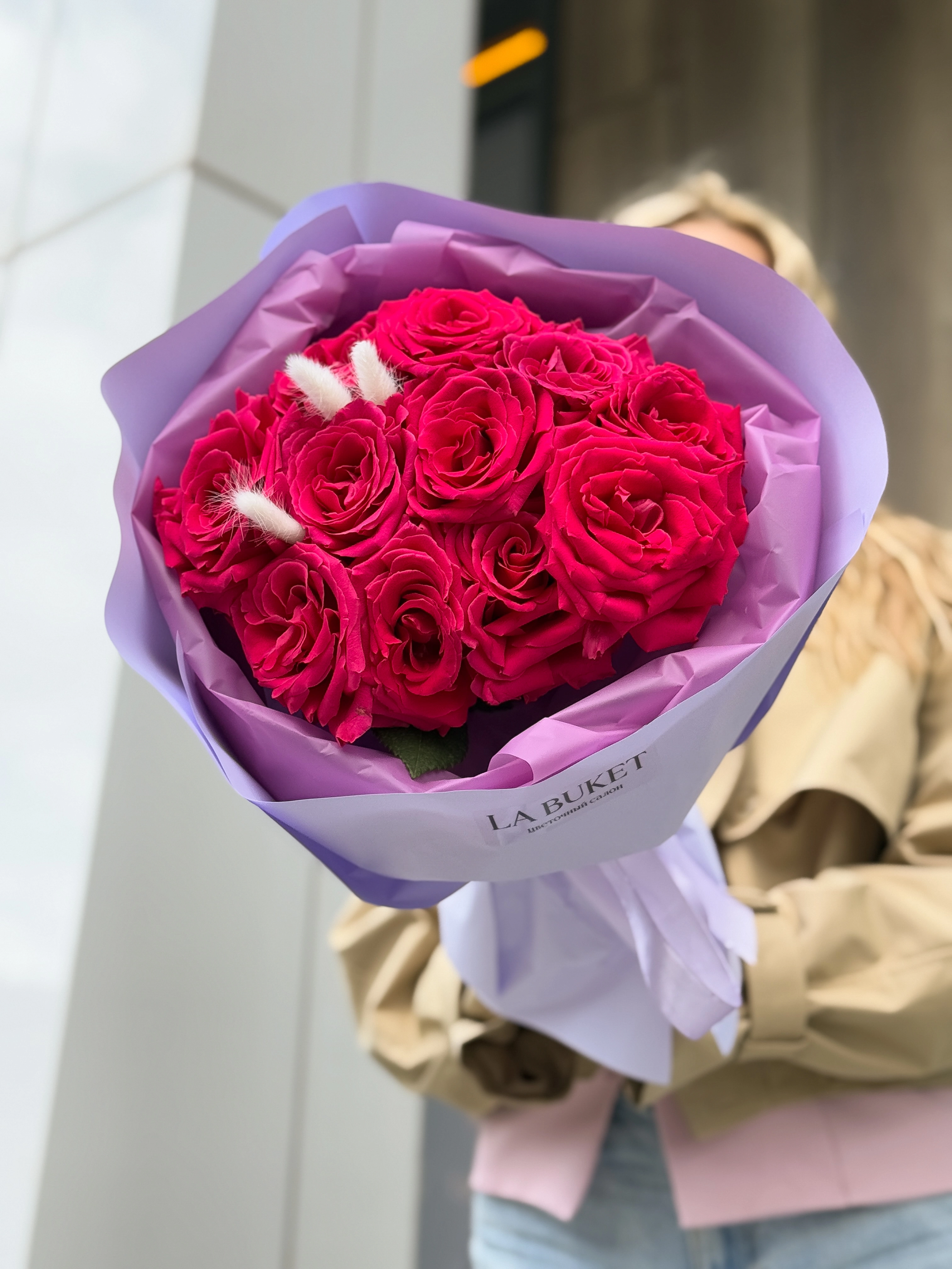 Букет из 11 французских малиновых роз в оформлении