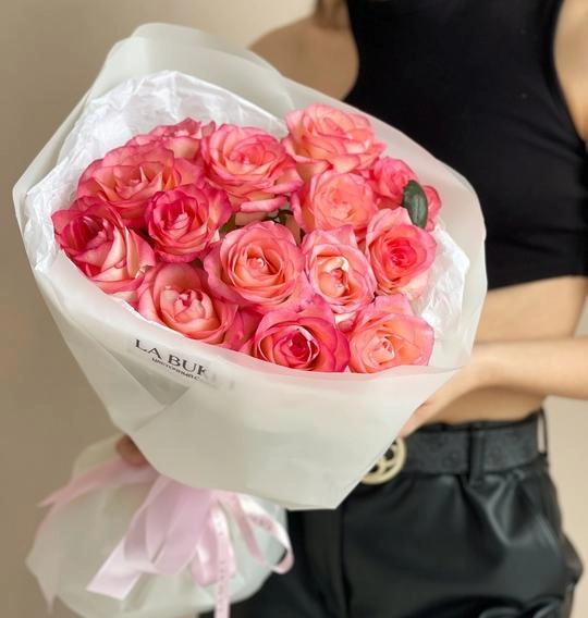 Букет из 15 бело-розовых роз 50/60 см в оформлении