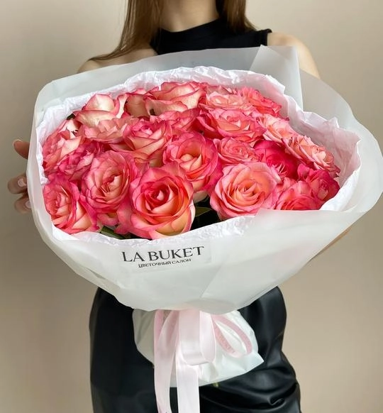 Букет из 25 бело-розовых роз 50/60 см в оформлении