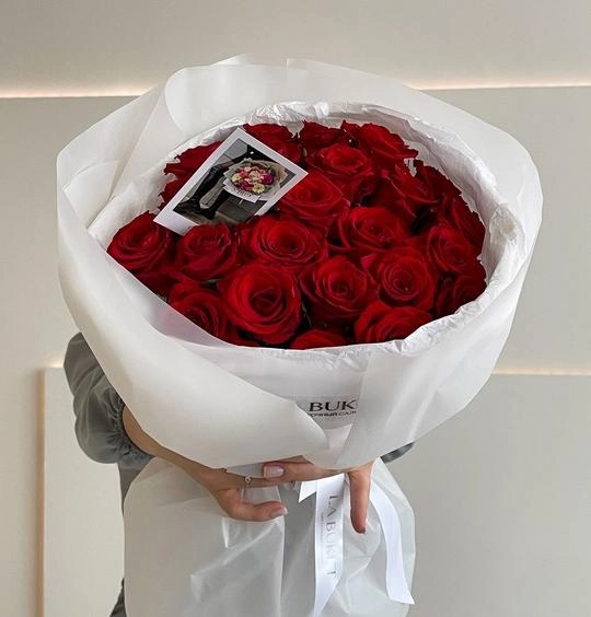 Букет из 25 бордовых роз в оформлении 50/60 см