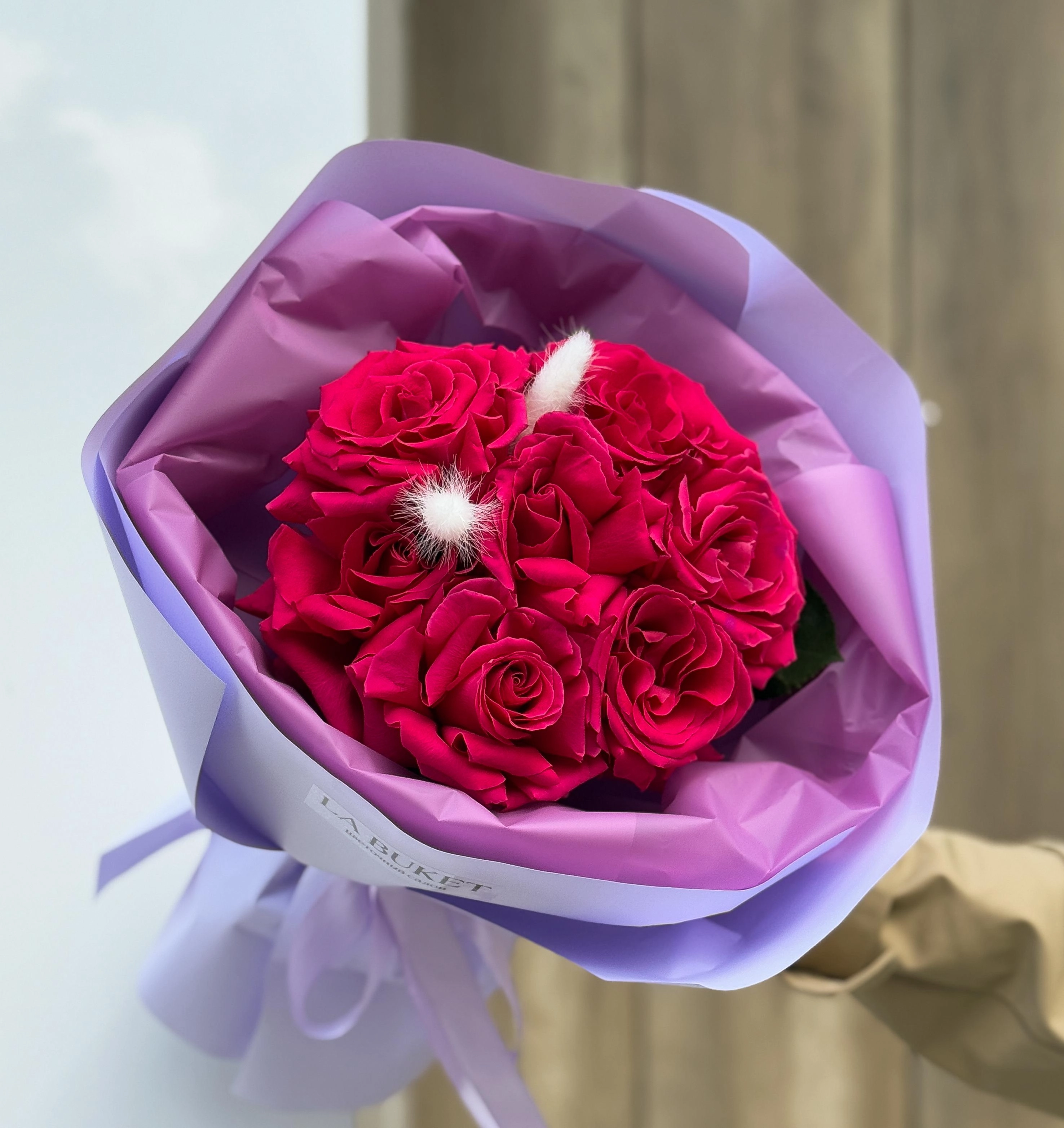 Букет из 7 французских малиновых роз в оформлении
