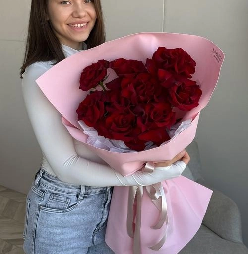 Букет из 9 красных французских роз в оформлении
