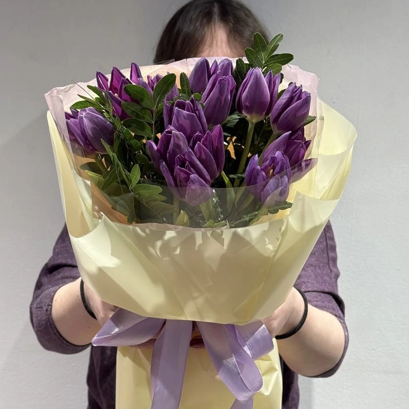 15 фиолетовых тюльпанов в оформлении