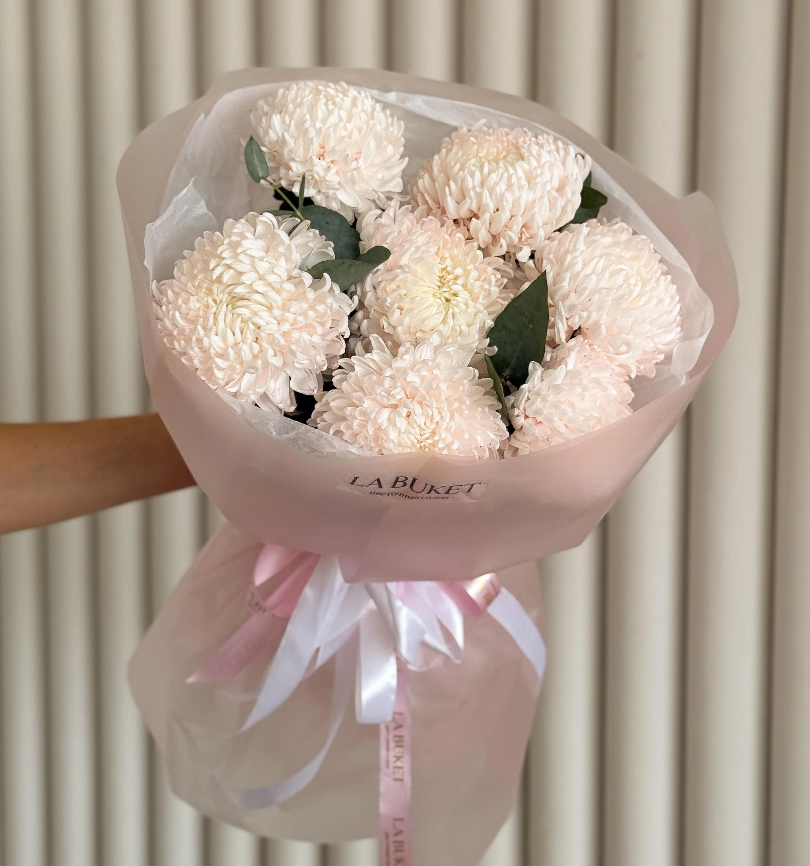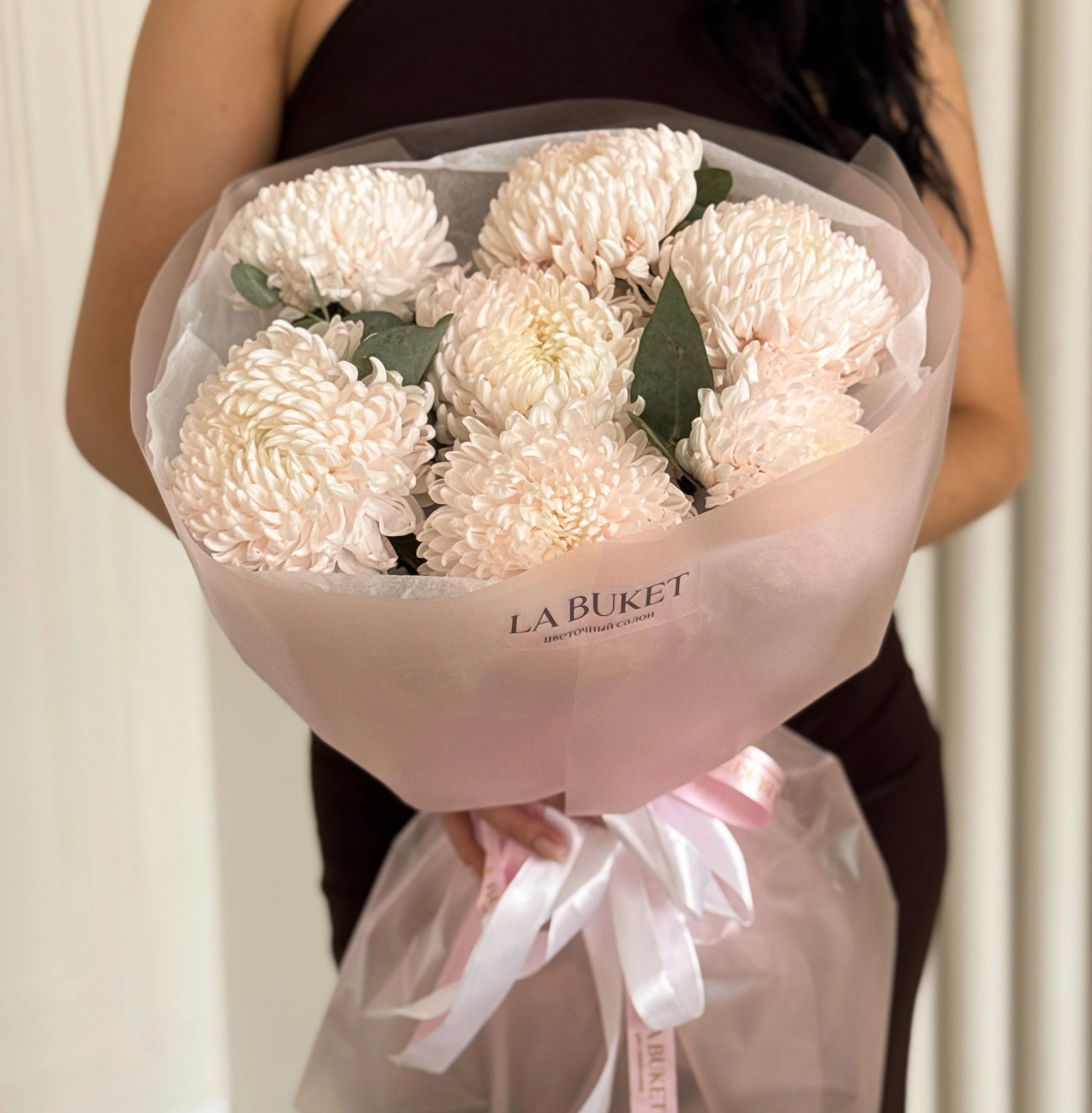 Букет из 7 одноголовых хризантем премиум с эвкалиптом