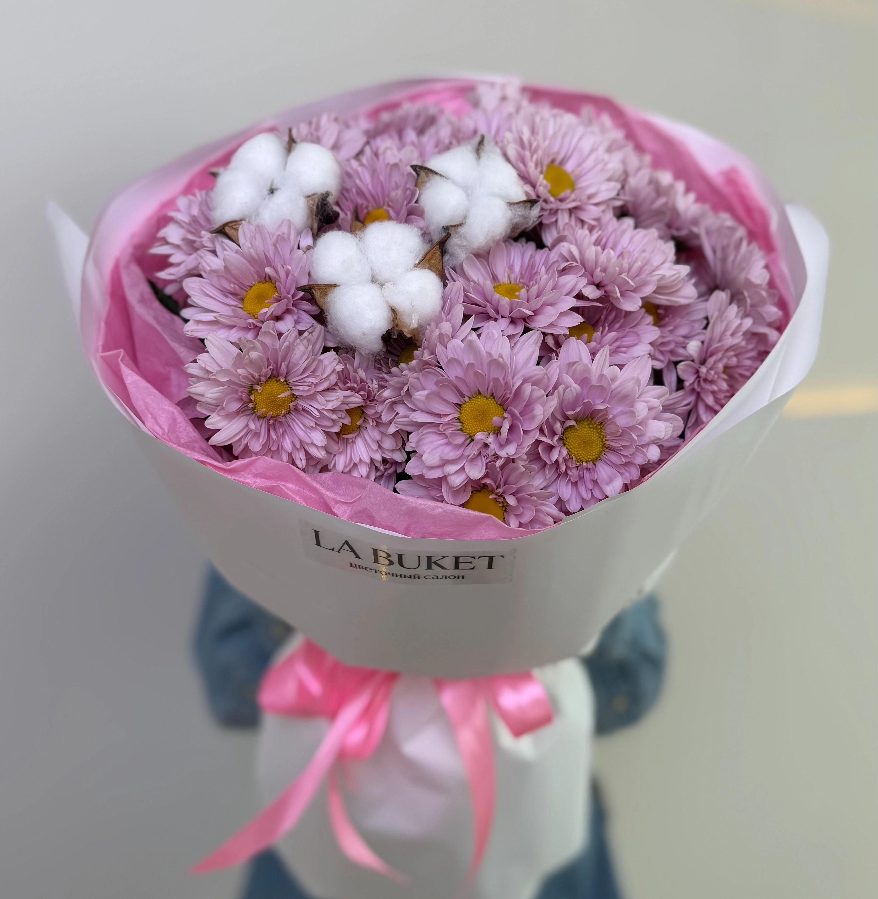 Букет сиреневых хризантем и хлопка