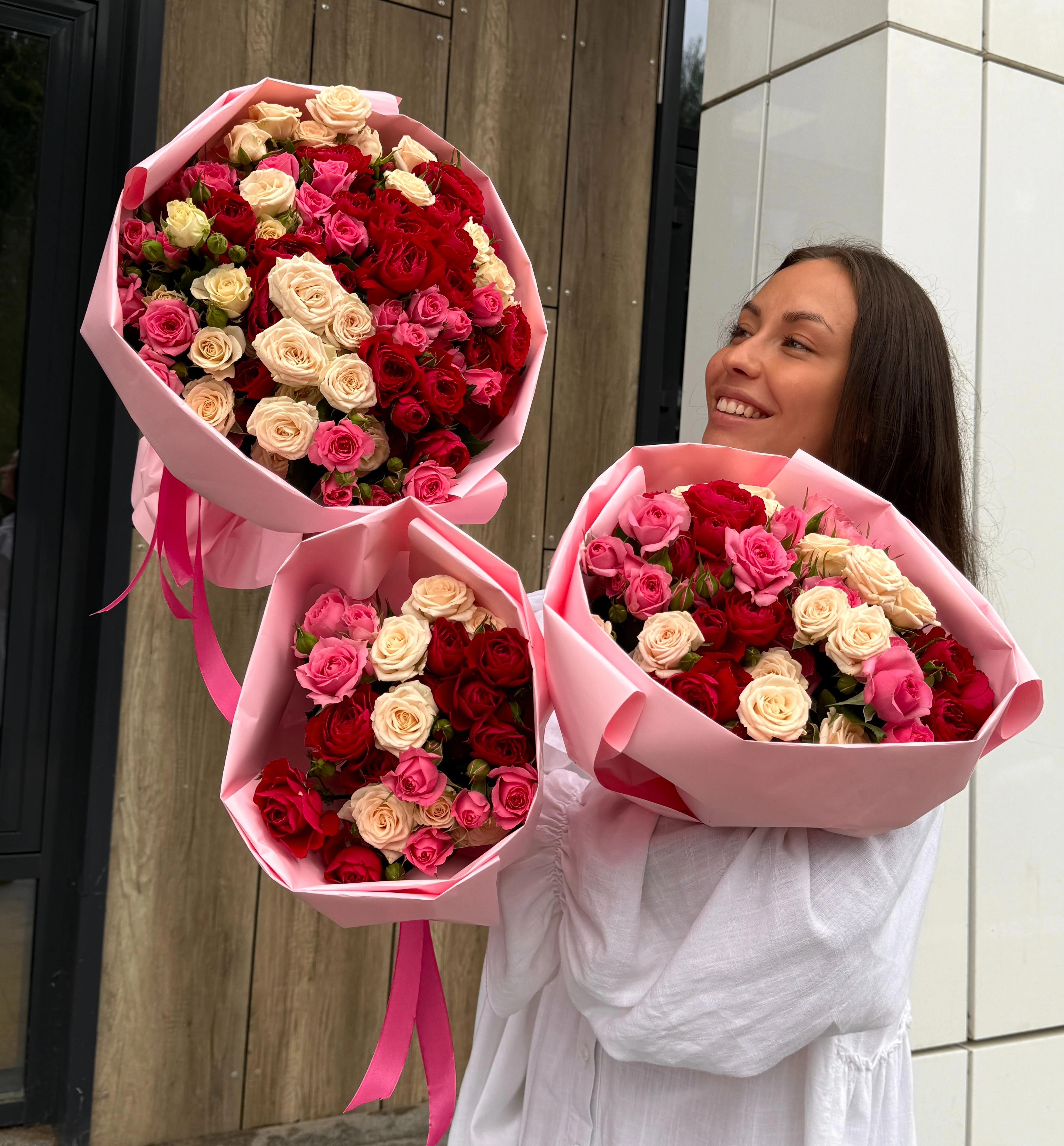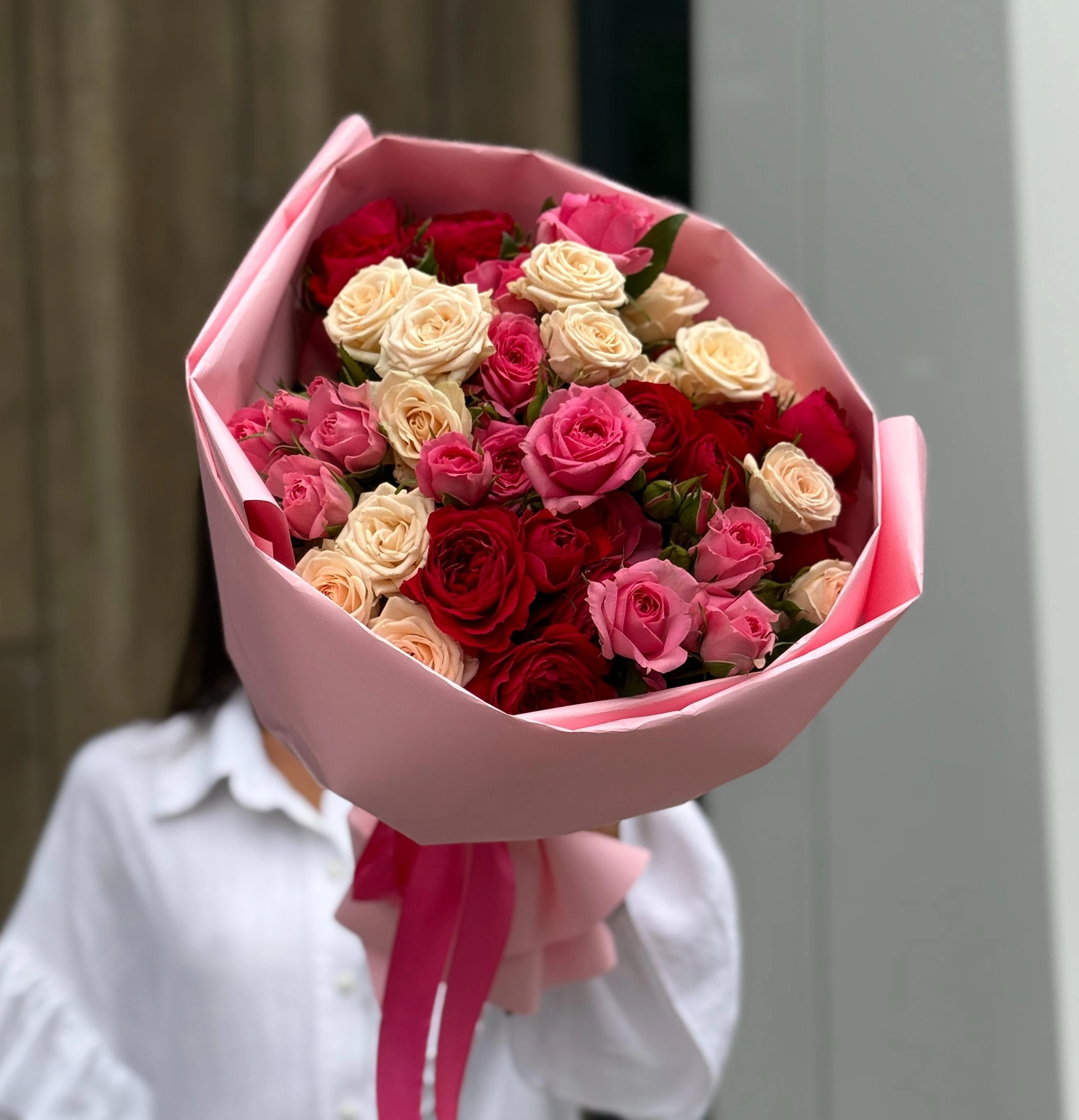 Микс из 15 пионовидных кустовых роз 40/50 см