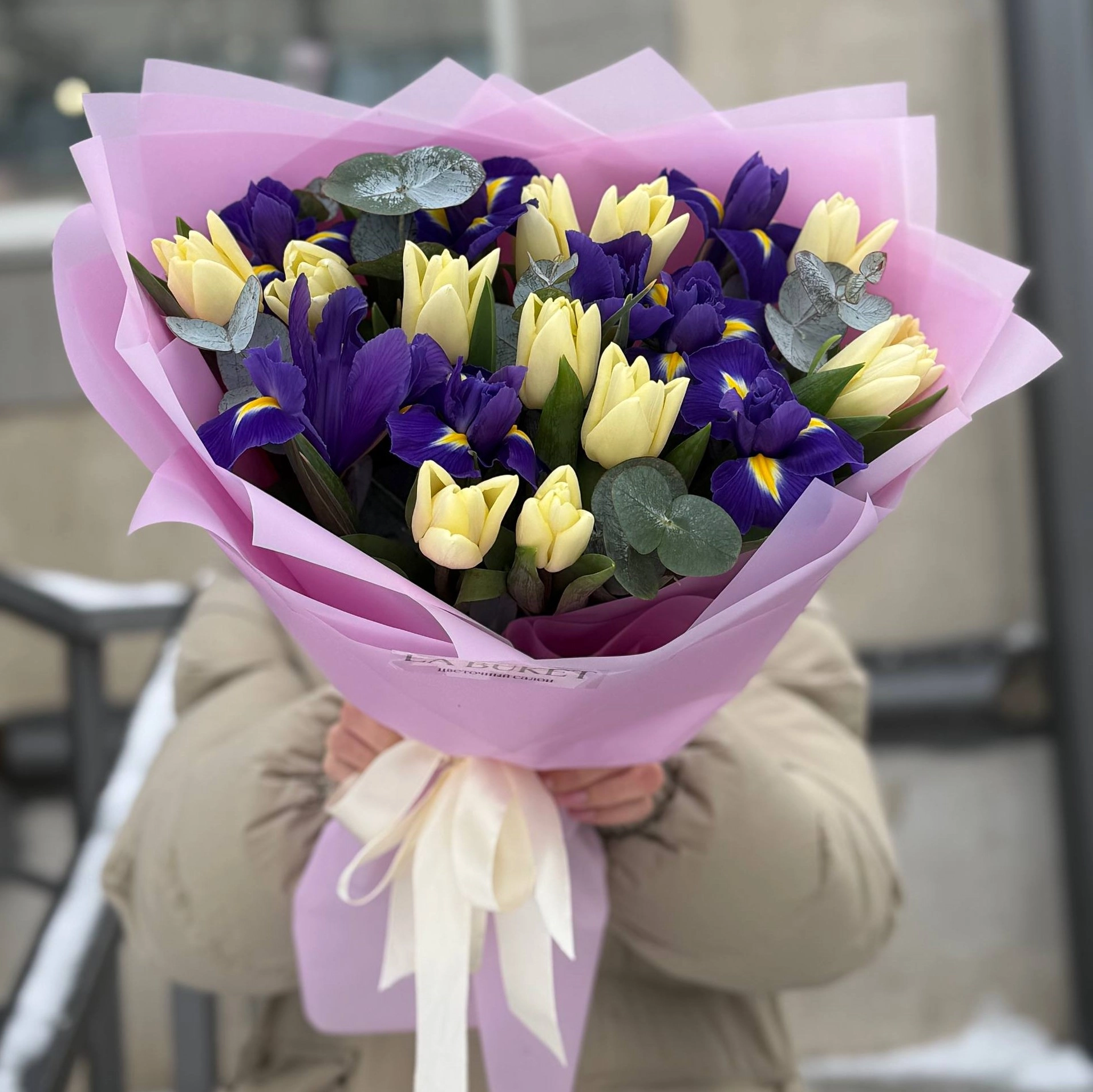 Составной букет из тюльпанов, ирисов и эвкалипта M