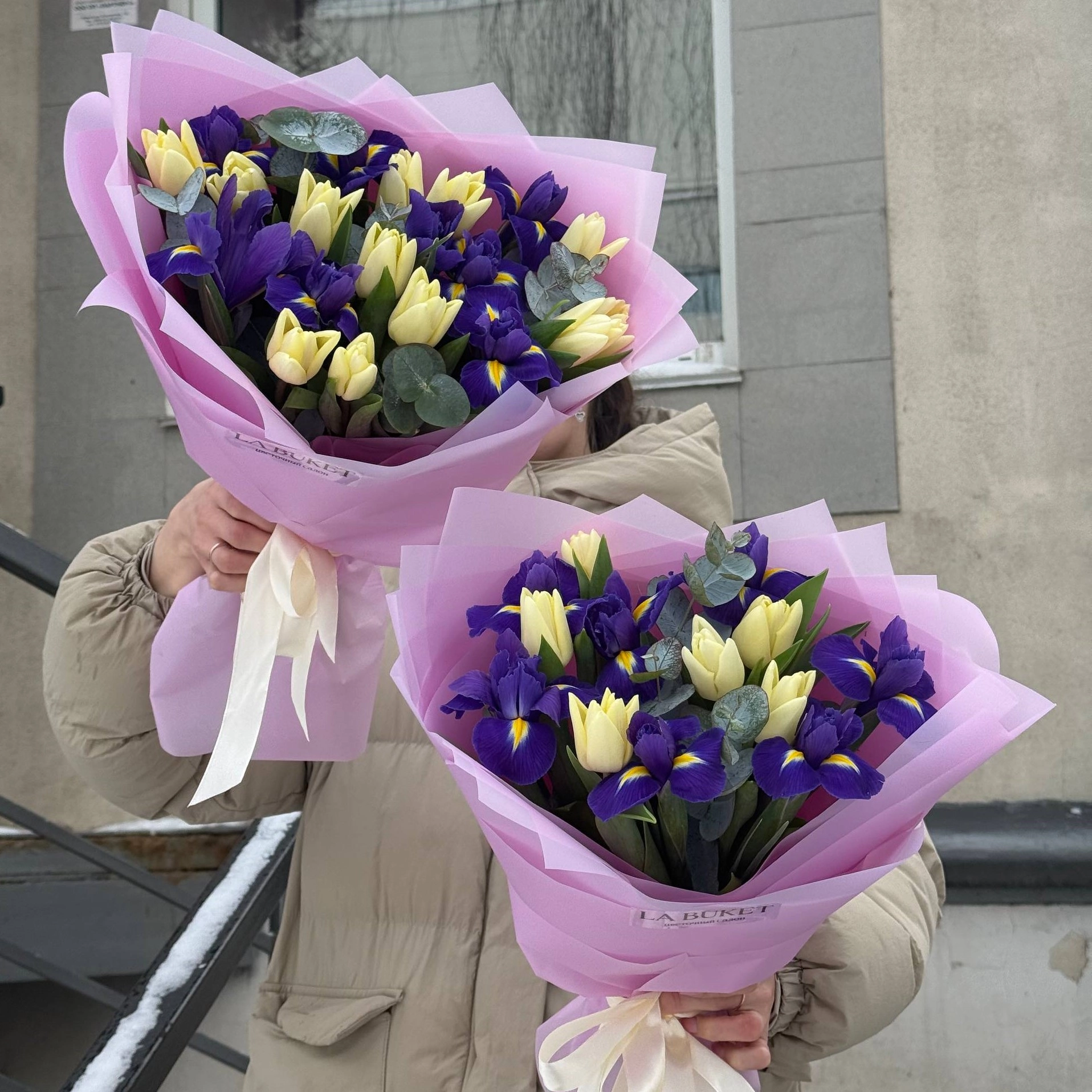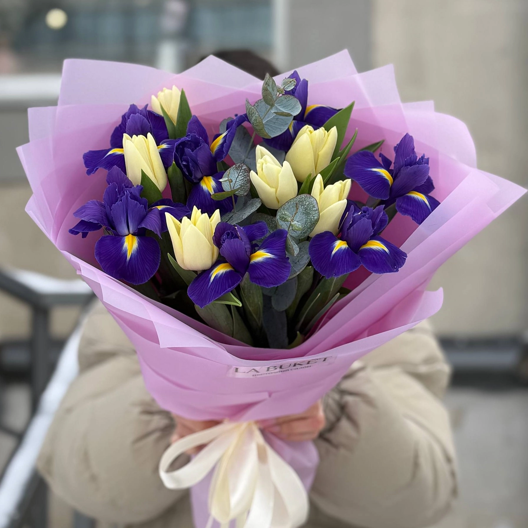 Составной букет из тюльпанов, ирисов и эвкалипта S